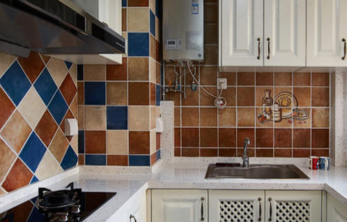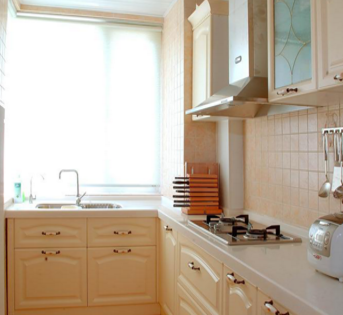 這款廚房面積相對狹小,過道只能容納一個人通行。白色鑲嵌式的整體櫥柜設計,有效的節(jié)省了空間,并且收納功能也很強大。墻磚采用斜紋的鋪貼與地面瓷磚互相呼應,濃濃的田園風情盡在其中。